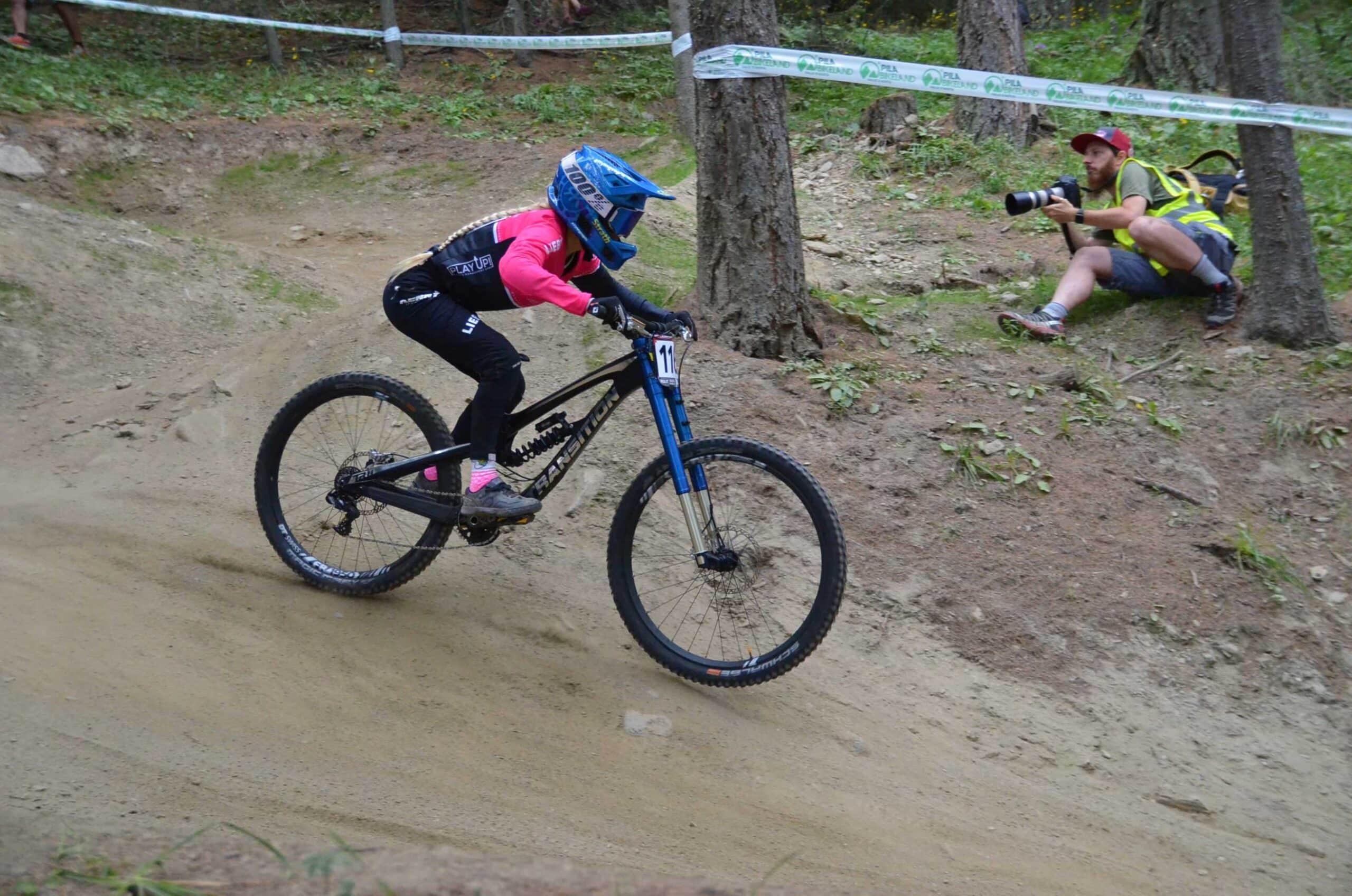 Ramona Kupferschmied nahm am Freitag im Training das erste Mal die Strecke in Pila (Aostatal, IT) unter die Räder. Sie war von der Strecke begeistert. Als man sie unterwegs auf dem Sessellift erblickte, sah man das breite Lächeln von Weitem. «Das ist meine Welt!», schwärmte Ramona. Am Samstag kurz nach 15 Uhr stand dann bereits die Qualifikation auf dem Programm. Trotz ein paar kleinen Fehlern erreichte sie das Mittelfeld. Sie war mit ihrem Run im Grossen und Ganzen zufrieden. Ihre lädierte Hand behinderte sie zum Glück nicht mehr allzu stark. Am Sonntag 14:10:30 ging es dann in den Finallauf. Ramona war gut drauf und voller Energie. 40 Minuten vorher machte sie sich, mittels Sessellift, mit ihrem Mechaniker auf dem Weg zum Start. Die erste Streckenhälfte bis zur Zwischenzeit gelang ihr gut. Auf der zweiten Streckenhälfte drehte sie dann richtig auf. Ganze 10 Sekunden schneller als in der Qualifikation, brachte sie ihren Run ins Ziel. Sie berichtete mit einem breiten Grinsen im Ziel: «Ich liebe diese Strecke. Das war mein bester Lauf an diesem Wochenende. Ich bin sehr zufrieden mit meiner Leistung. Einige Male bin ich ziemlich am Limit gefahren, aber es hat gepasst!». Ramona erreichte schlussendlich den 14. Rang von 27 Eingeschriebenen. Damit holte sie sich weitere UCI-Punkte. Ihr erst fünftes Rennen und Europäisch bereits im Mittelfeld angekommen. Was dürfen wir da künftig noch von Ramona erwarten? Lassen wir uns überraschen und freuen wir uns an jedem Schritt vorwärts.