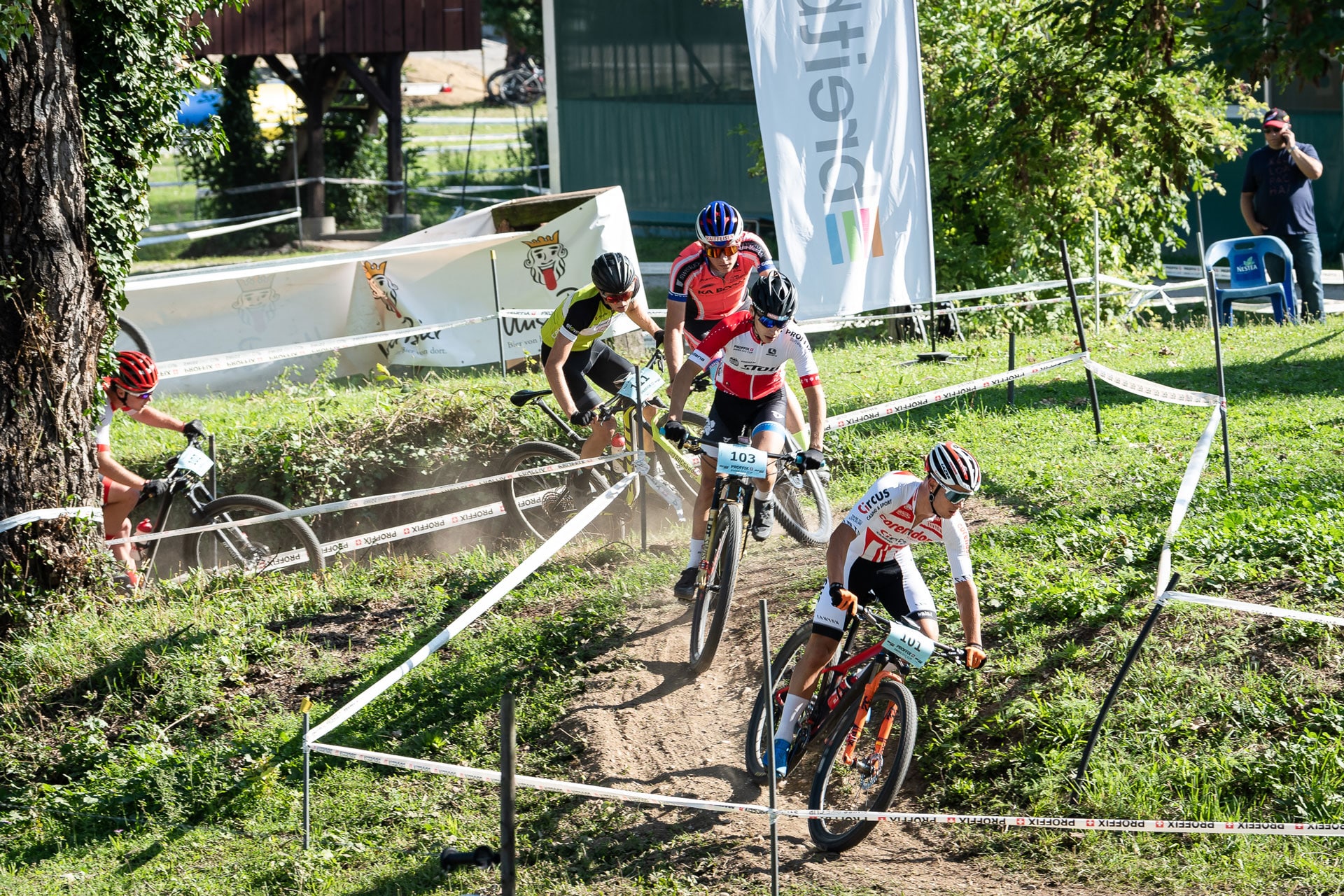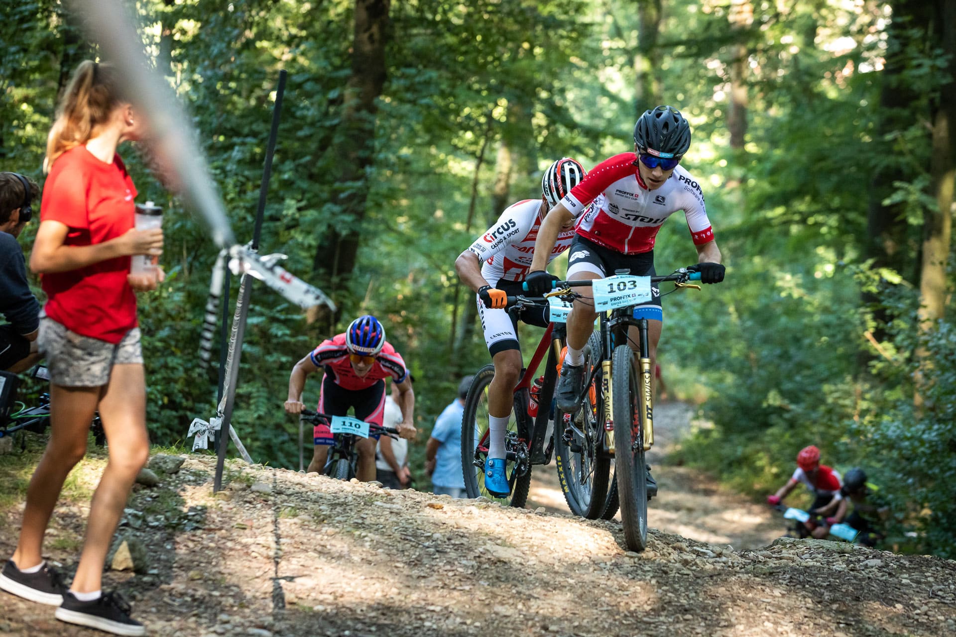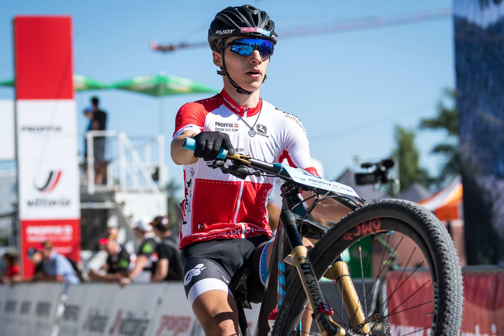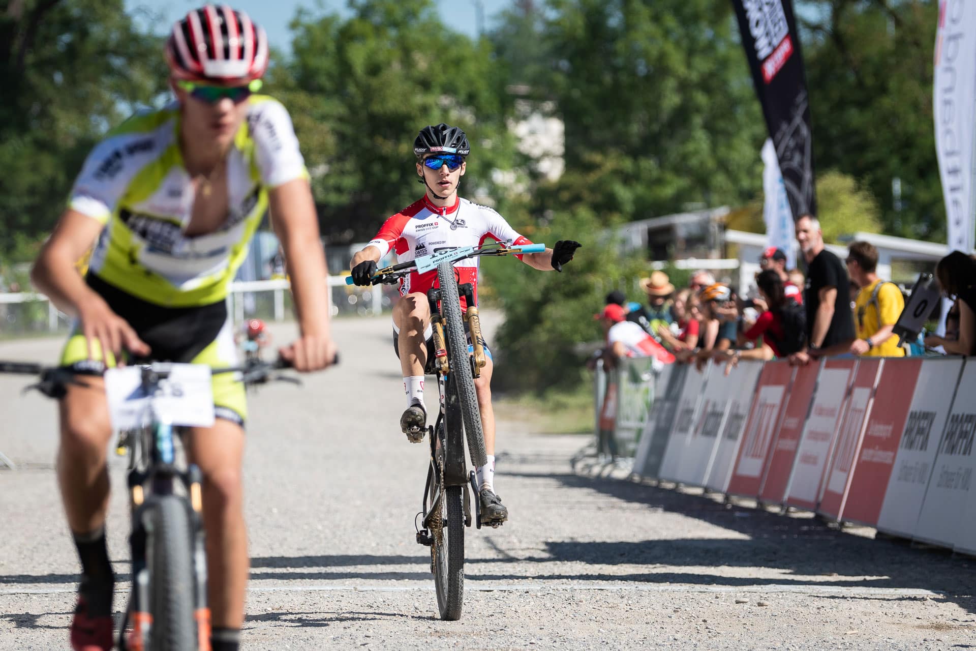 Und Luca Schätti der zusammen mit Jonas ebenfalls um 0935 startete? Was war von ihm nach dem mittelschweren Sturz am Weltcup auf der Lenzerheide zu erwarten? Luca beschrieb sein Rennen wie folgt: «Ich fühlte mich gut und erwischte einen guten Start. Ab der ersten Runde war das Tempo sehr hoch und es bildete sich eine siebenköpfige Spitzengruppe. Diese Gruppe harmonierte in den flachen Teilstücken nicht gut und deshalb startete ich im Aufstieg eine Attacke um die Gruppe zu spalten. Übrig blieb nur Loris Rouiller und ich. Wir teilten uns die Führungsarbeiten und fuhren bis in die letzten Runde zusammen. Seinem Antritt konnte leider nicht mehr folgen und so fuhr ich auf dem zweiten Rang über die Ziellinie. Mit diesem Ergebnis holte ich wichtige Punkte und kann mich bereits vor dem Finalrennen in Lugano Gesamtsieger des Proffix Swiss Bike Cups nennen».
